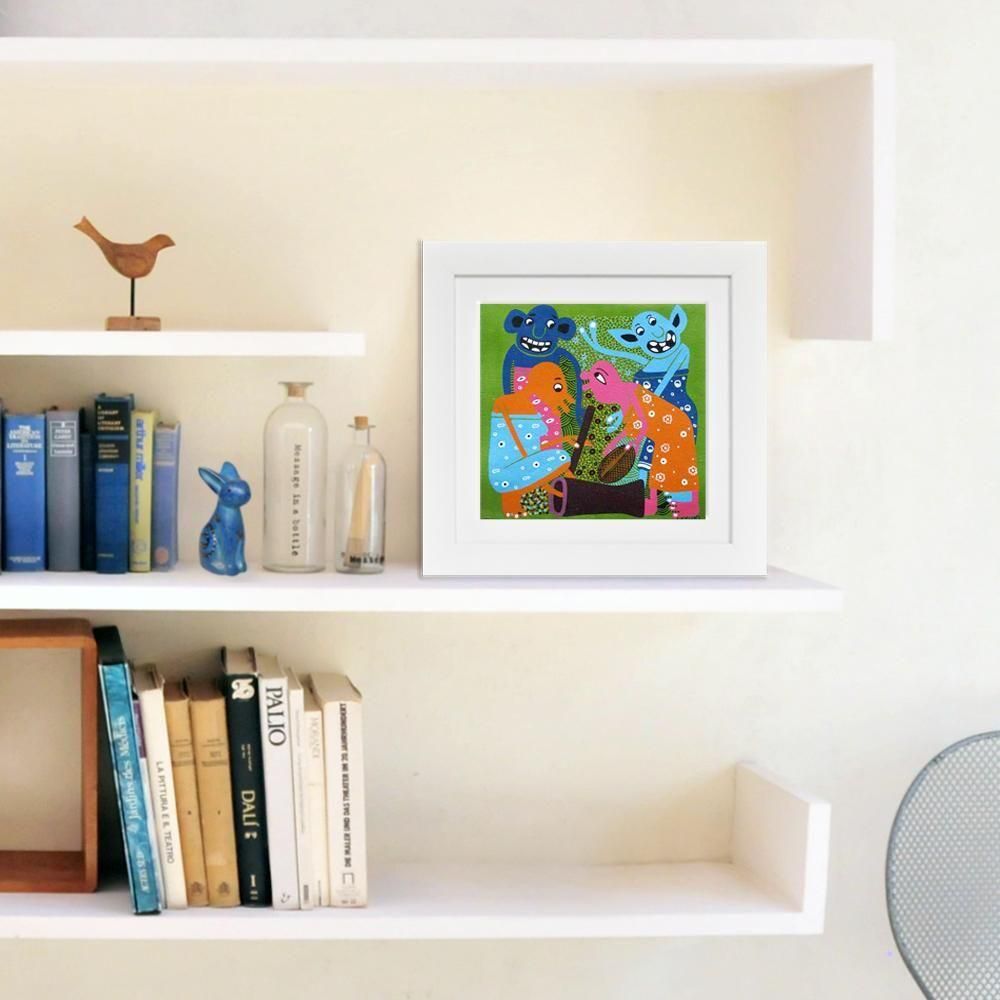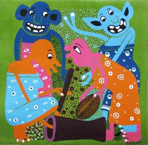 ☆にぎやかにおしゃべりしながら、臼で搗いてウガリ粉を作るシャターニ(悪魔、精霊)たちがキュートに描かれたサユキの作品です。