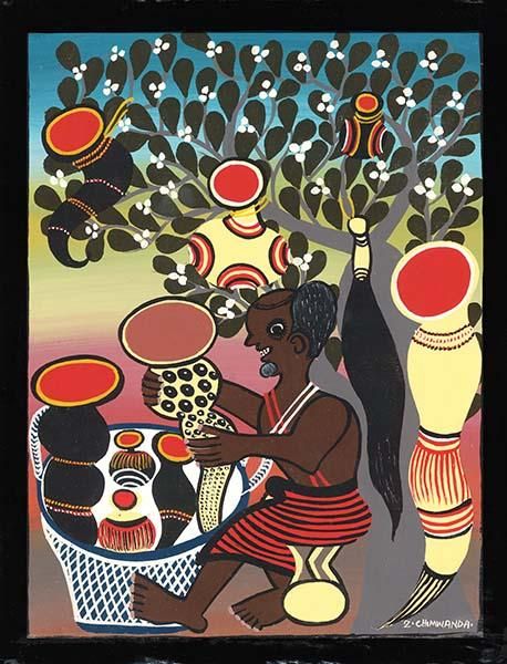 ☆人々の病を癒す、アフリカのムガンガ〜呪医。儀式に使う道具を手にする姿が色鮮やかに描かれています。古参アーティストチムワンダの作品です。