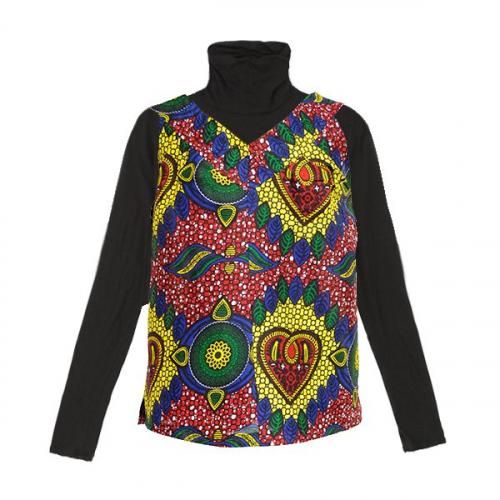 ☆東アフリカのアフリカンプリント布・キテンゲで仕立てた、ステッチが入ったVネック衿と、豊かなフレアで体をやさしく包むゆったりシルエットが素敵なノースリーブブラウスです。