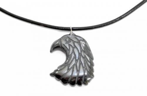 ☆天然石ヘマタイトをカービングした、勇ましいイーグルデザインのトップがかっこいい、レザーネックレスです。