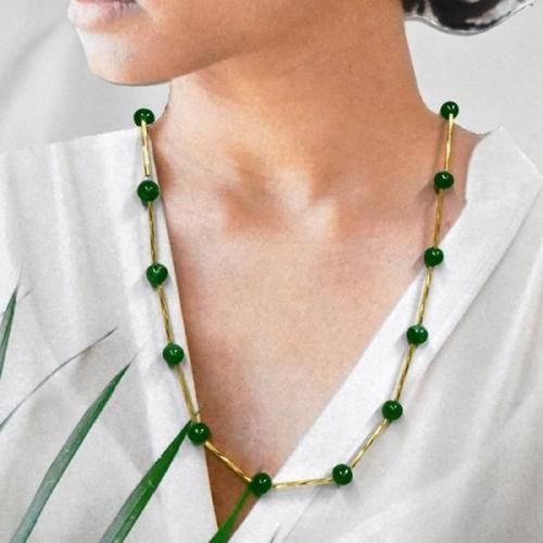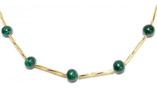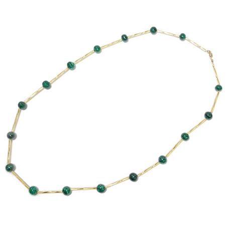 ☆天然石マラカイトと、ゴールドのガラスパーツをリズミカルに配したステーションロングネックレス。軽やかな印象を与え、胸元を明るく彩ります。オリジナルネックレスです。