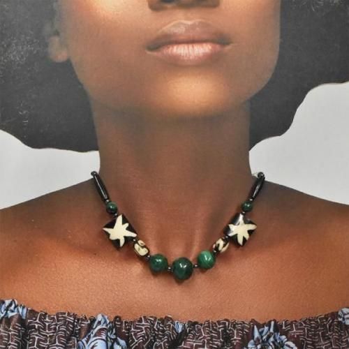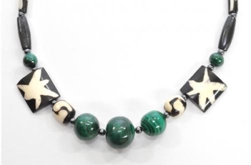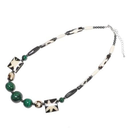 ☆天然石マラカイトの粒トップと、スクエアやバンブー形のカウボーン(牛骨)、ヘマタイトの粒を組み合わせた、オリジナルネックレスです。