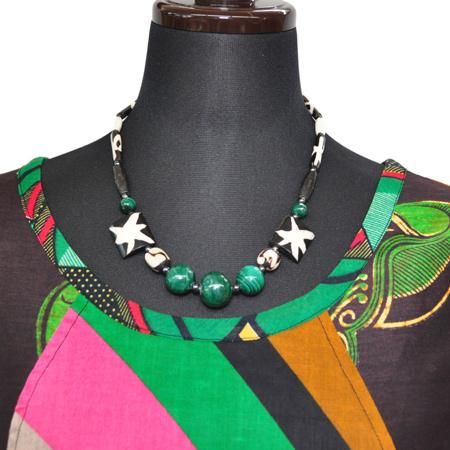マラカイトの美しい緑縞模様と、ヘマタイトの上品な光沢、自然な優しい手触りのカウボーン(牛骨)の組み合わせがユニーク、大人の女性の普段使いにふさわしい上品なネックレスです。