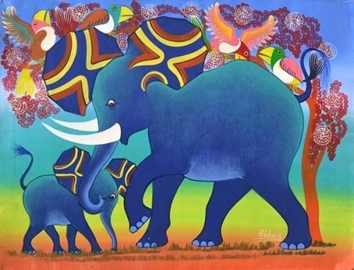 ☆アフリカンカラーの模様が美しいゾウの親子と、花の樹に集うアフリカの鳥たちが描かれています。パステルカラーの色遣いが美しいアバスの作品です。