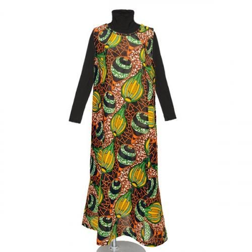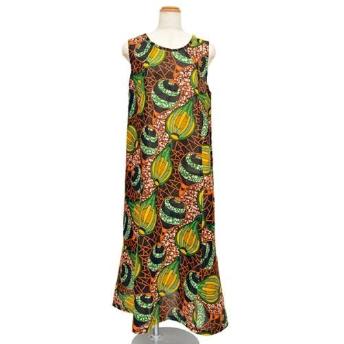 ▼柄の説明:黒、オレンジの幾何学と、茶、白色のろうけつ玉模様地に、緑、黄、黒色のひょうたんが連続する柄のキテンゲで仕立てた、マーメイドラインのロングマキシ丈 ノースリーブワンピース。