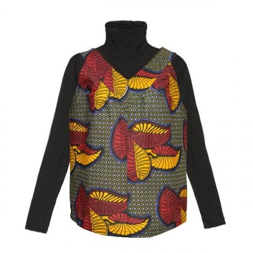 ☆東アフリカのアフリカンプリント布・キテンゲで仕立てた、ステッチが入ったVネック衿と、豊かなフレアで体をやさしく包むゆったりシルエットが素敵なノースリーブブラウスです。