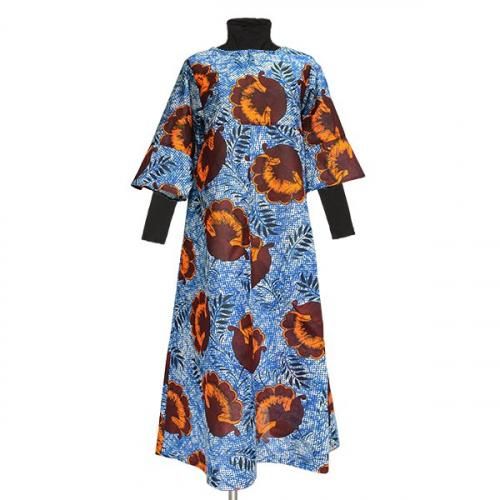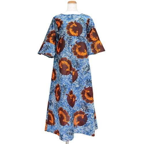 ☆東アフリカのプリント布・キテンゲで作られた、フレア袖がポイント、ゆったりキレイなシルエットのロングワンピースです。