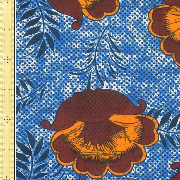 ▼柄の説明:青、白色のろうけつワレ模様地に、茶、オレンジ色で大輪の花と黒色の葉っぱが描かれた柄