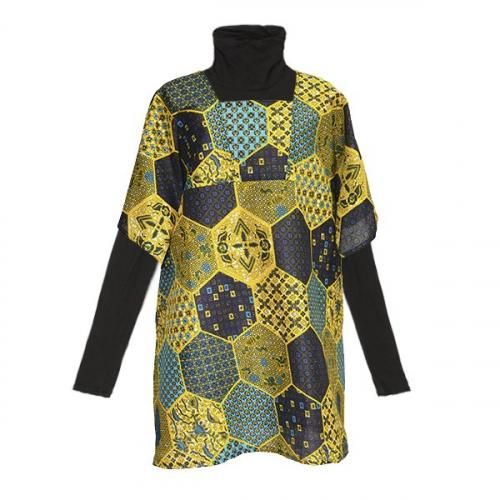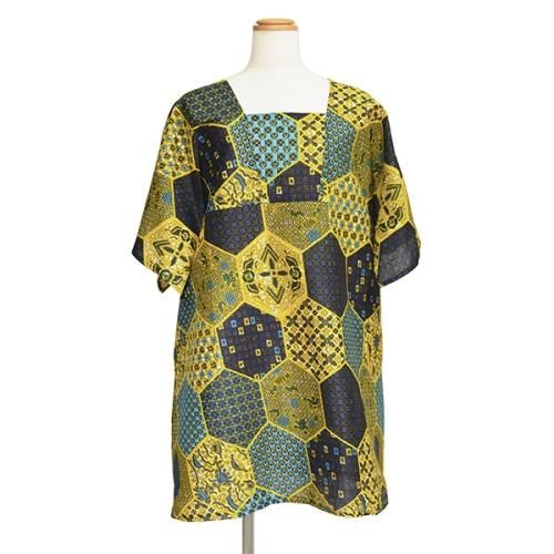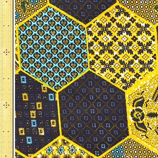 ▼柄の説明:黄、青、黒、緑色で様々なアフリカンテキスタイルの文様のハニカム格子が並んだ柄