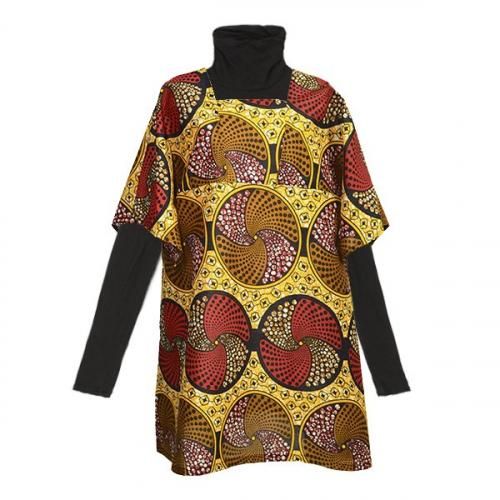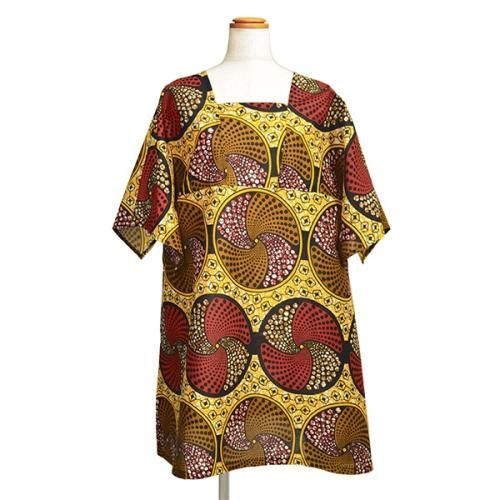 ☆東アフリカのプリント布・キテンゲで仕立てた、快適に過ごせる究極のリラックスウェア、カフタンドレス。頭からすっぽり被って楽に着られる、ゆったりシルエットのチュニックです。