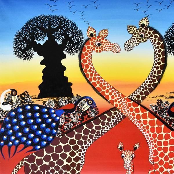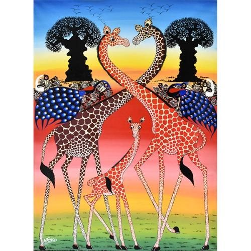 ☆バオバブの大樹がそびえるサバンナで、アフリカの大地に生きるキリンの親子と鳥たちがカラフルにいきいきと描かれています。グラデーションが美しい雄大なムテコの作品です。