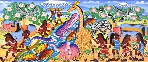 ☆キリマンジャロとメルーのふもとに暮らす動物たちと、マサイ族の楽しい日常風景をコミカルなタッチで描いたムクンバの作品です。
