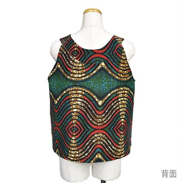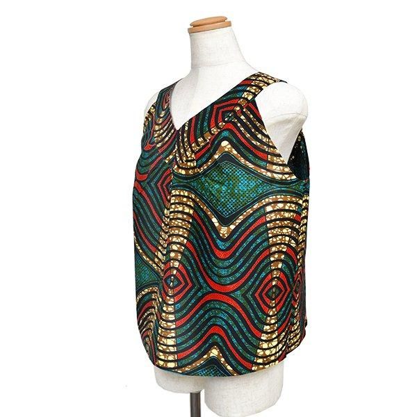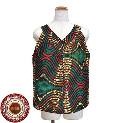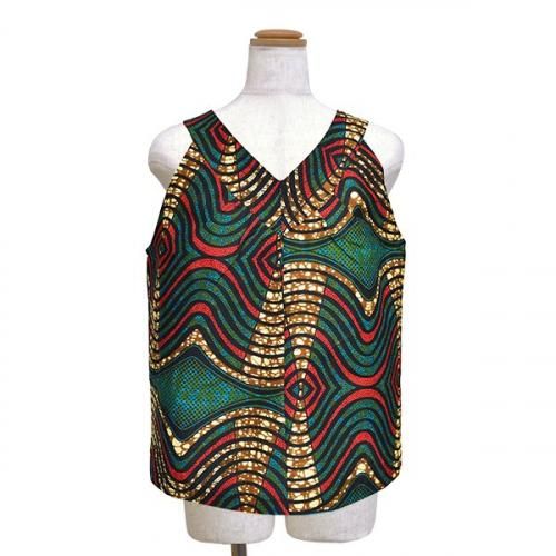 ☆東アフリカのアフリカンプリント布・キテンゲで仕立てた、ステッチが入ったVネック衿と、豊かなフレアで体をやさしく包むゆったりシルエットが素敵なノースリーブブラウスです。