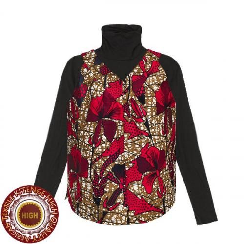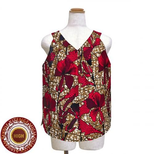 ☆東アフリカのアフリカンプリント布・キテンゲで仕立てた、ステッチが入ったVネック衿と、豊かなフレアで体をやさしく包むゆったりシルエットが素敵なノースリーブブラウスです。