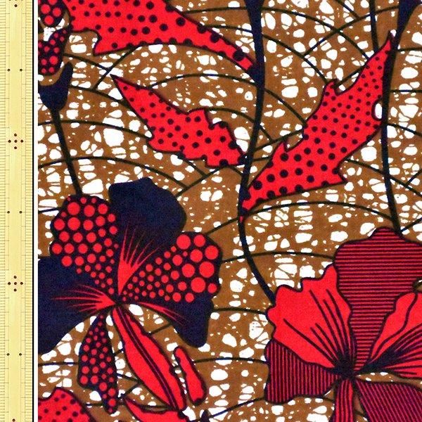 ▼柄の説明:茶、白色のろうけつ玉模様に、赤、黒色でさまざまな蘭の花柄
