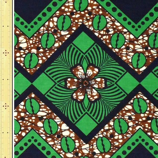 ▼柄の説明:茶、白色のろうけつワレ模様地に、緑、黒色でコーヒー豆と花が描かれたスクエアボーダー柄キテンゲ