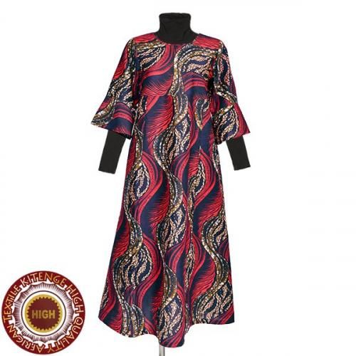 ☆東アフリカのプリント布・キテンゲで作られた、フレア袖がポイント、ゆったりキレイなシルエットのロングワンピースです。