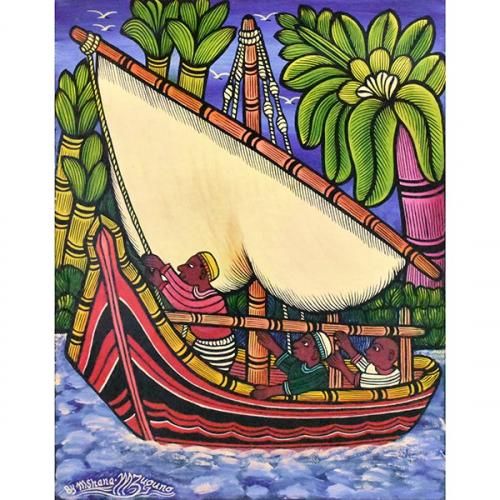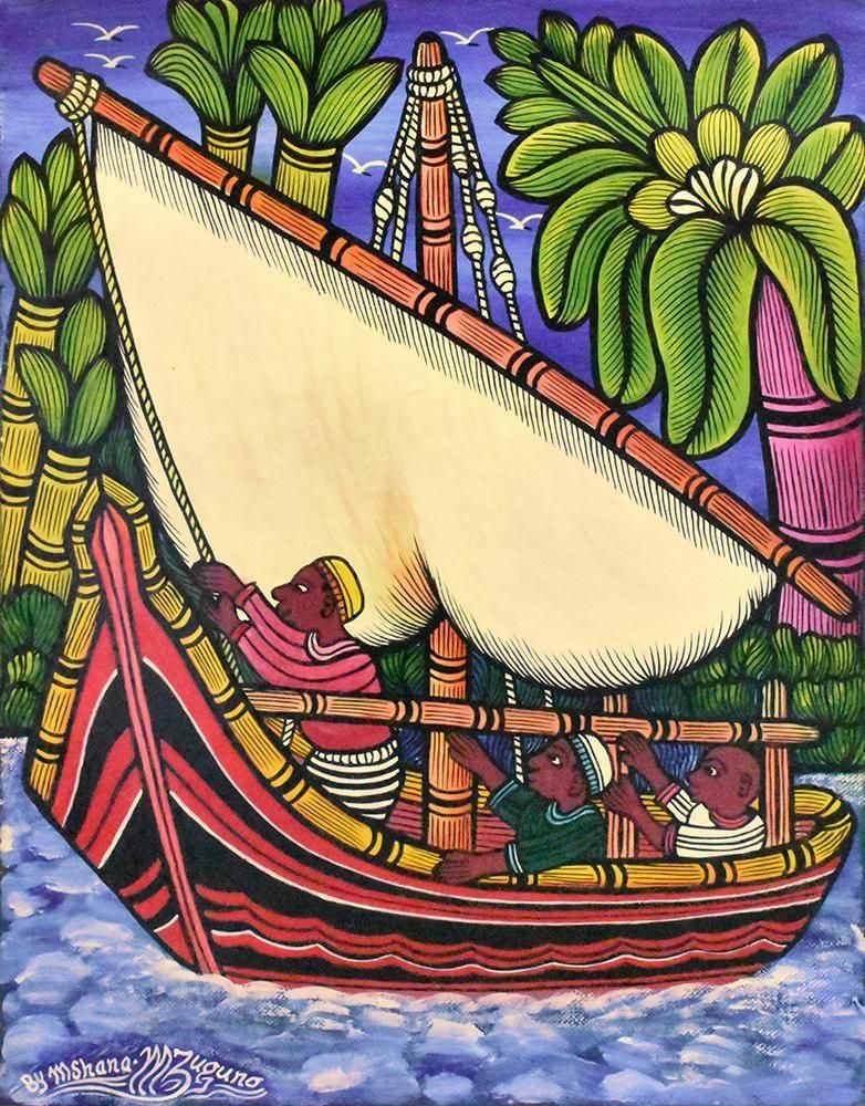 ☆青く広がる海原に浮かぶ赤いダウ船に乗り、航海する青年と子供たち。様々な植生をカラフルに生き生きと描く、ムシャーナ・ムズグノの作品です。