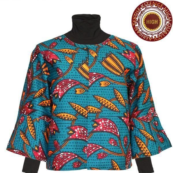 ☆東アフリカのプリント布・キテンゲで仕立てた、フレア袖がポイントのノーカラーボレロショートジャケット。ふんわりはおるだけで、主役級です!