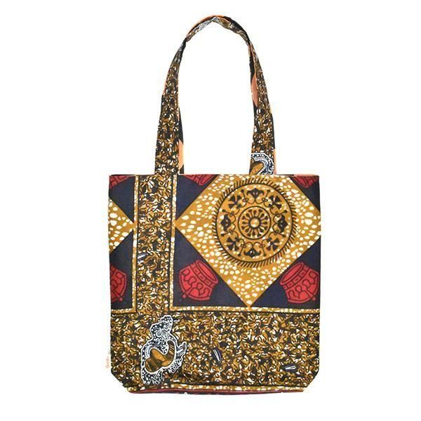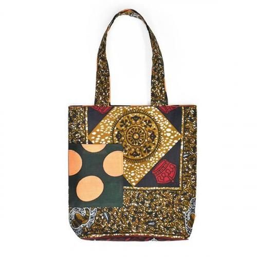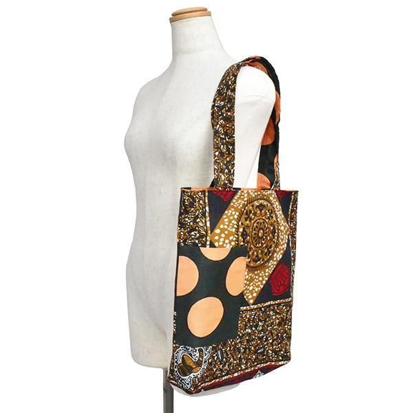 ☆東アフリカのプリント布・キテンゲで仕立てた、リバーシブルトートバッグ。B4書類や雑誌がすっぽり入る大き目サイズ、肩にもかけられる長さのショルダータイプです。