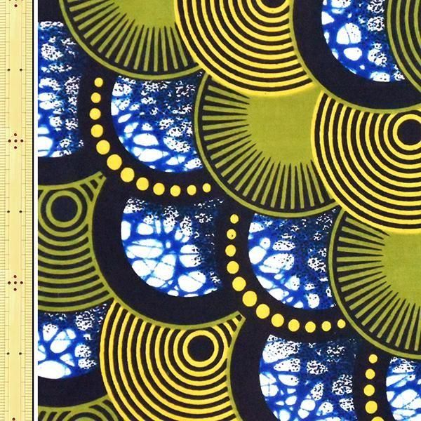 ▼柄の説明:青、緑、黄、黒色で、ろうけつワレ模様やサークル、ドット柄のうろこ模様柄のキテンゲ