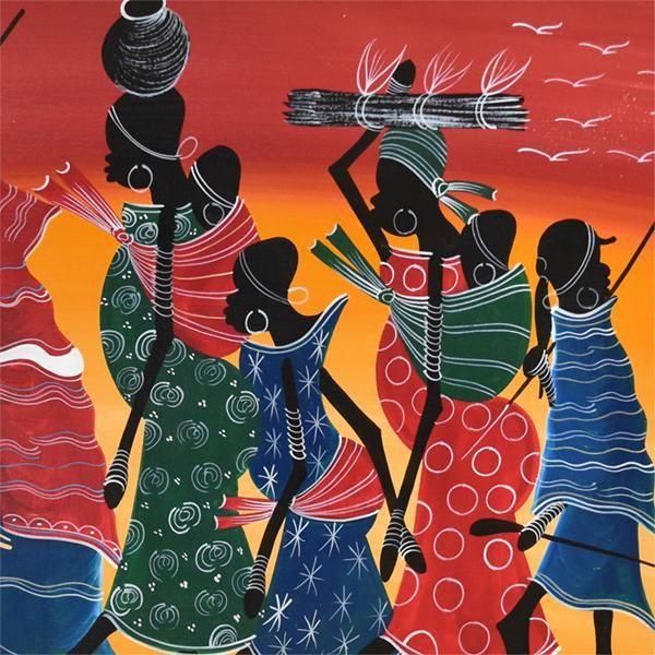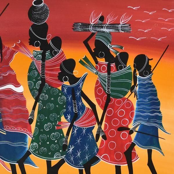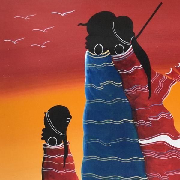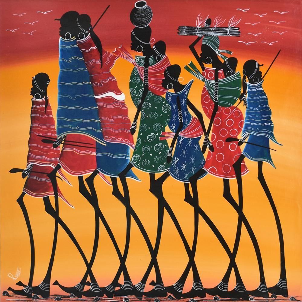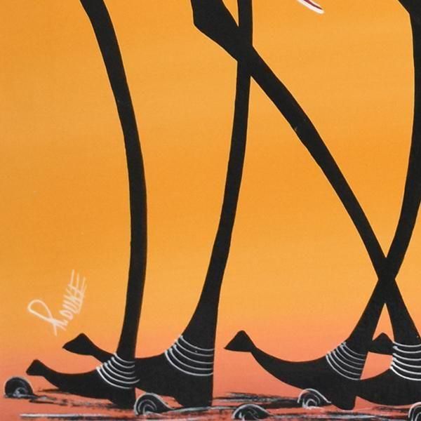 ☆サバンナを行く、布を纏い歩むマサイたち。赤オレンジのグラデーションを背景に、美しいマサイのシルエットが映えるドゥケの作品です。