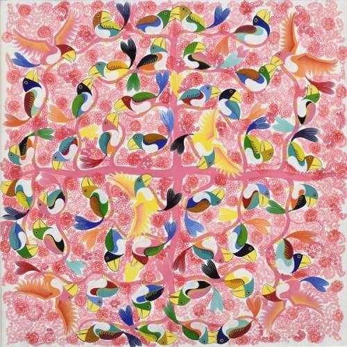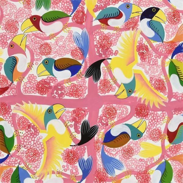 ☆ホワイトの背景に、ピンクの花が咲き誇る木に集う、色とりどりのカラフルなアフリカの鳥が描かれています。パステルカラーを得意とするアバスの作品です。