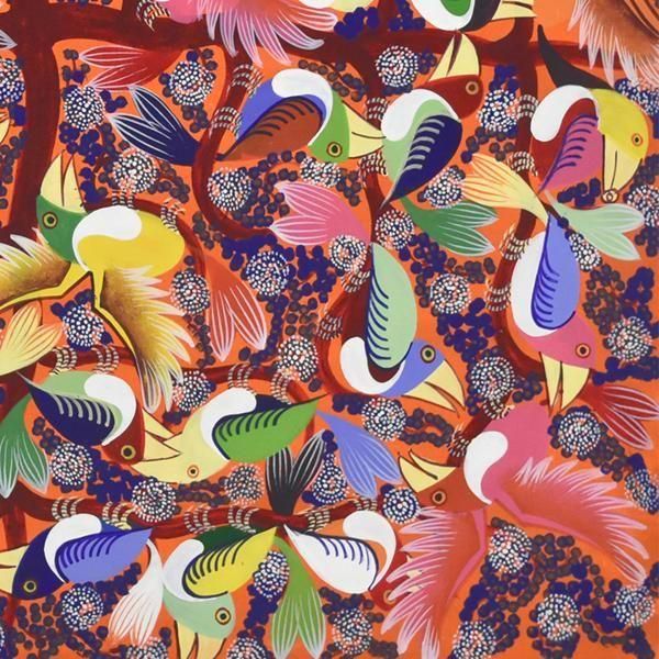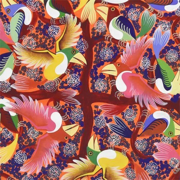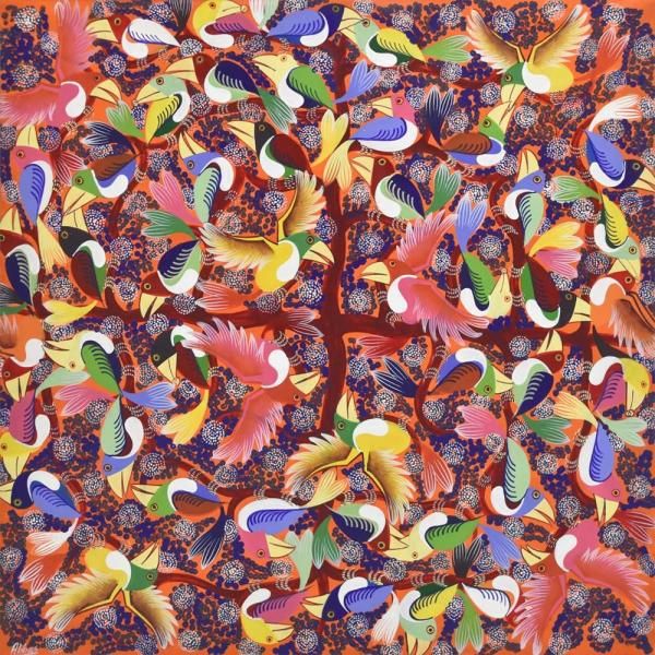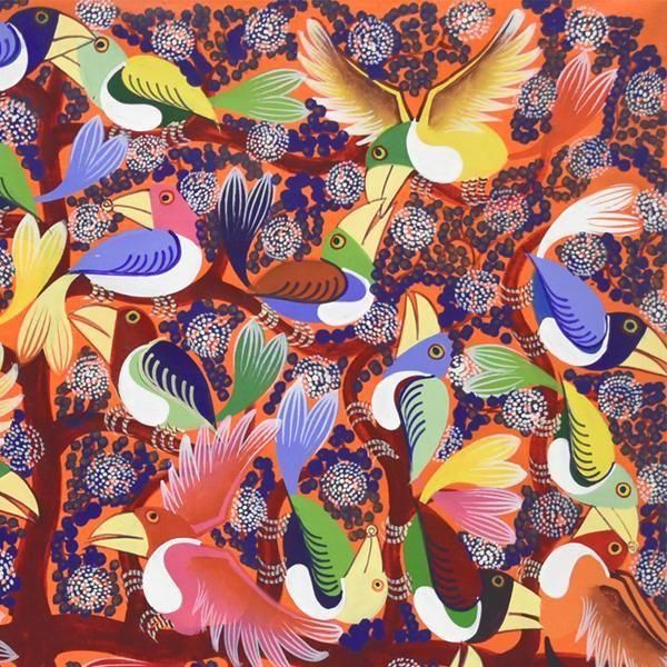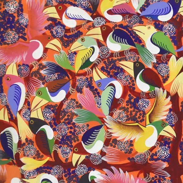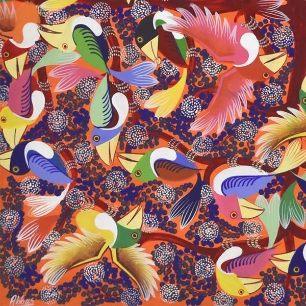 ☆オレンジの背景に、青い花が咲き誇る木に集う、色とりどりのカラフルなアフリカの鳥が描かれています。パステルカラーを得意とするアバスの作品です。