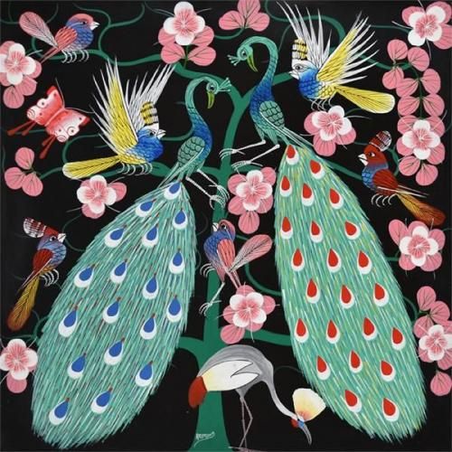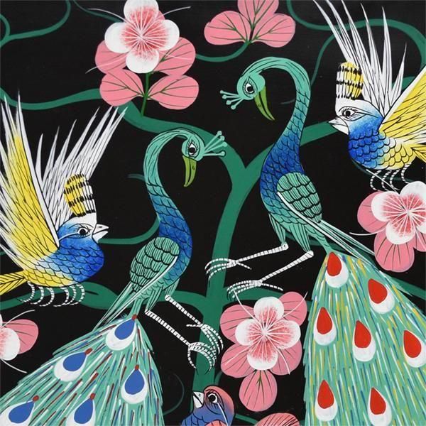 ☆カラフルな羽根が美しいクジャクのカップルとカラフルな鳥たち。ブラックの背景とのコントラストが美しい、レイモンドの作品です。