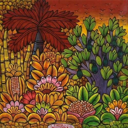 ☆熱帯の花木が密生する虹色のジャングルの夕暮れ風景。様々な植生をカラフルに生き生きと描く、ムシャーナ・ムズグノの作品です。