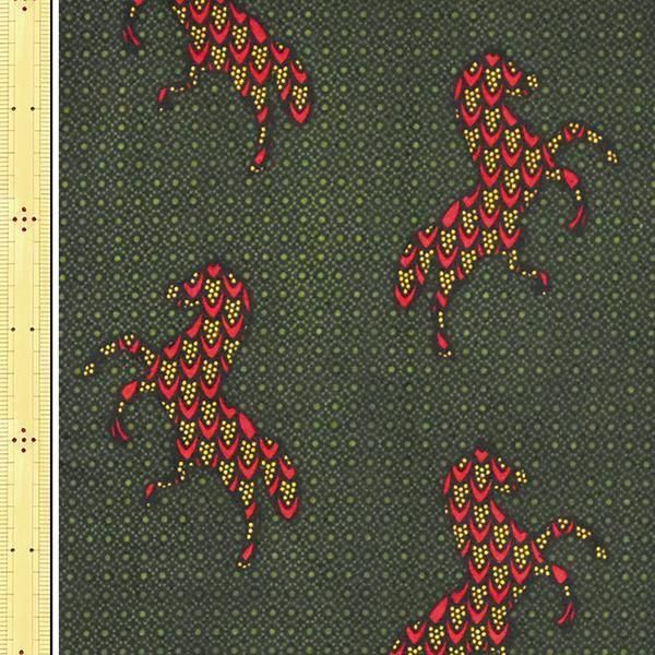 ▼柄の説明:緑、黒色のバーズアイドット地に、赤、黄色のうろこ紋柄の馬が配置されている柄