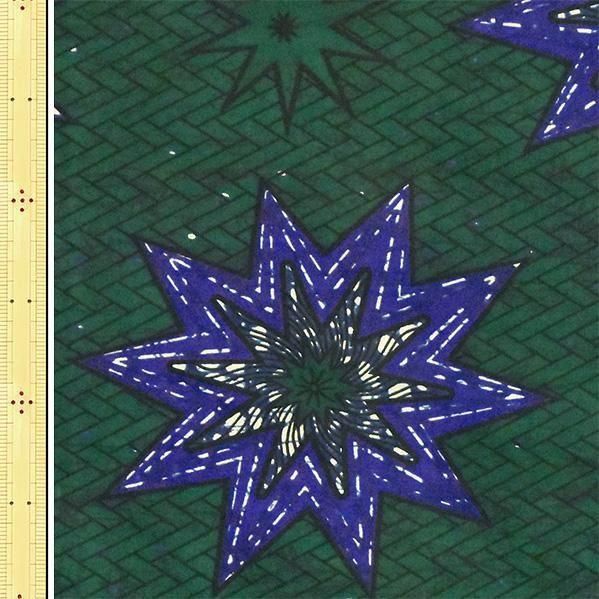 ▼柄の説明:緑色に黒色の網目模様地に、青色の大きな星がちりばめられている柄