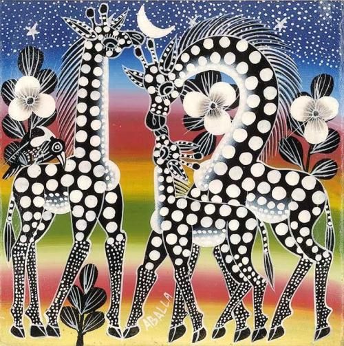 ☆満天の星空のもと、仲良く語らうキリンの家族と鳥が、グラデーションを背景にモノクロで美しく描かれた、アブダラの作品です。