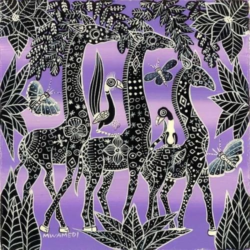 ☆モノトーンで表現された美しい模様のキリンの家族が、熱帯の植物の下で仲良く戯れています。パープルの背景に繊細に描かれた、ムワメディの作品です。