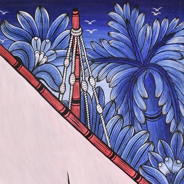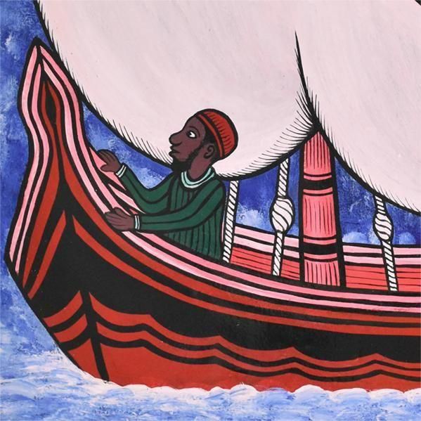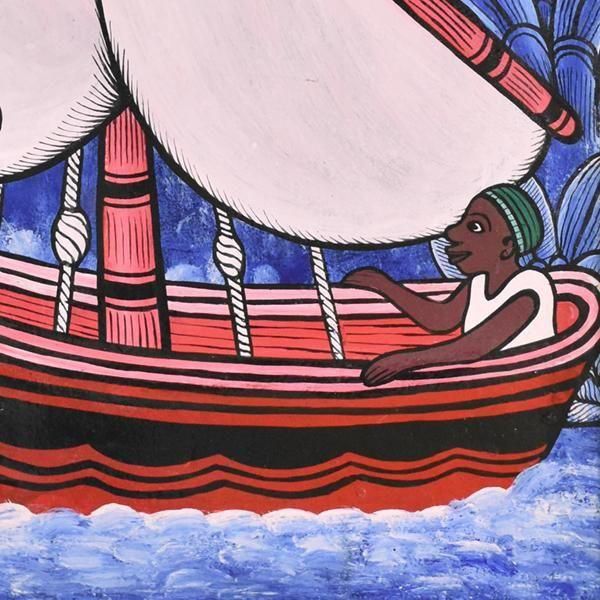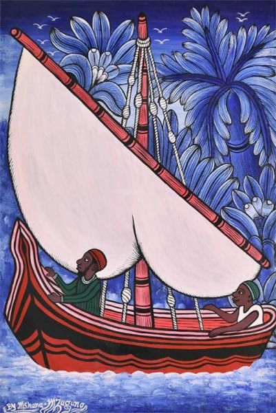 ☆青く広がる海原に浮かぶ赤いダウ船に乗り、航海する青年と子供たち。様々な植生をカラフルに生き生きと描く、ムシャーナ・ムズグノの作品です。