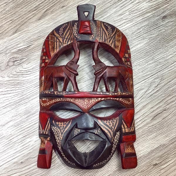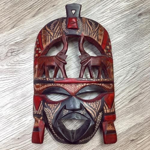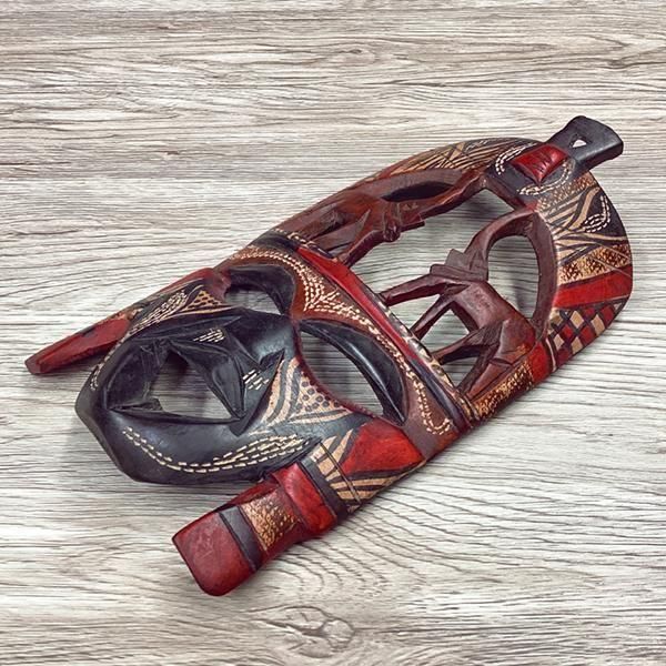 ☆マホガニーの木の色と赤を基調に、マサイの浮き彫りが施されています。上部は壁に掛けて飾れるように彫られています。