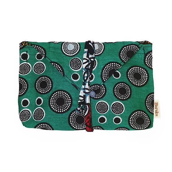 ☆カラフルなアフリカ布キテンゲで仕立てたヒモ巻きポーチ。入れる物を選ばず、自由な大きさで紐を巻くだけ。大小 2サイズ展開。