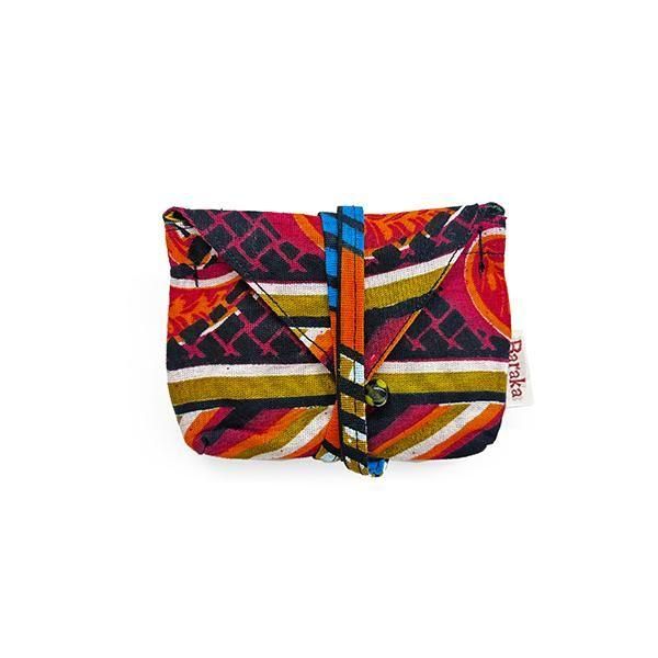☆カラフルなアフリカ布キテンゲで仕立てたヒモ巻きポーチ。入れる物を選ばず、自由な大きさで紐を巻くだけ。大小 2サイズ展開。