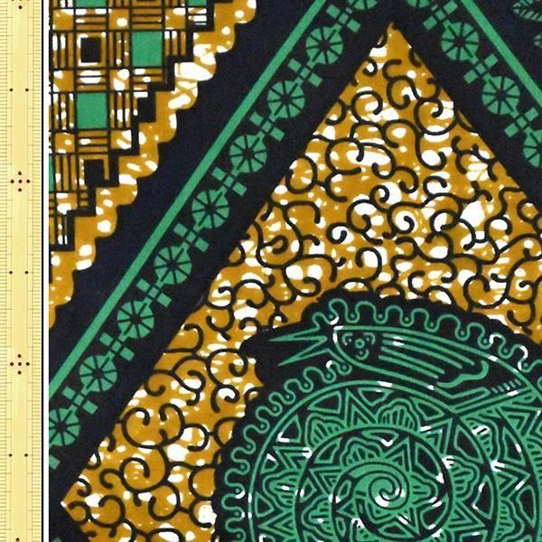 ▼柄の説明:茶、白色のろうけつ玉模様地に、緑、紺色の大きな菱形に、槍モチーフやスクエアタイル、カタツムリがあしらわれている柄のキテンゲ