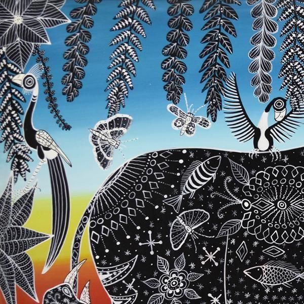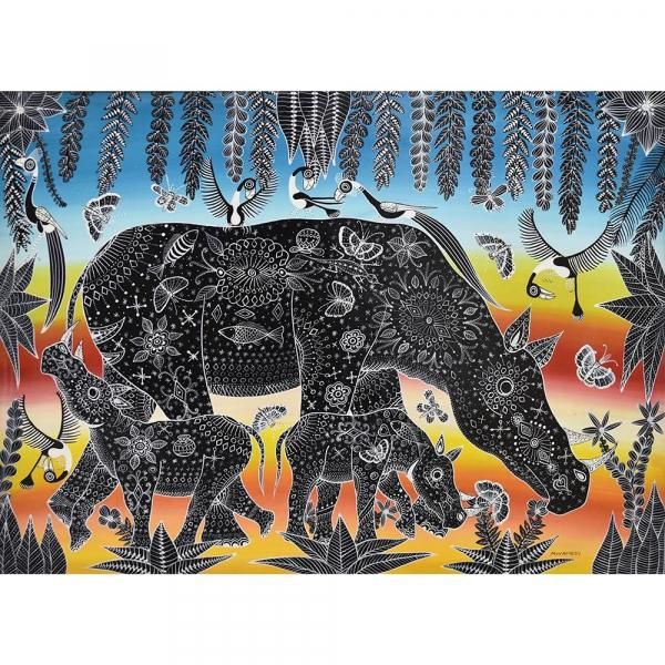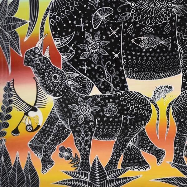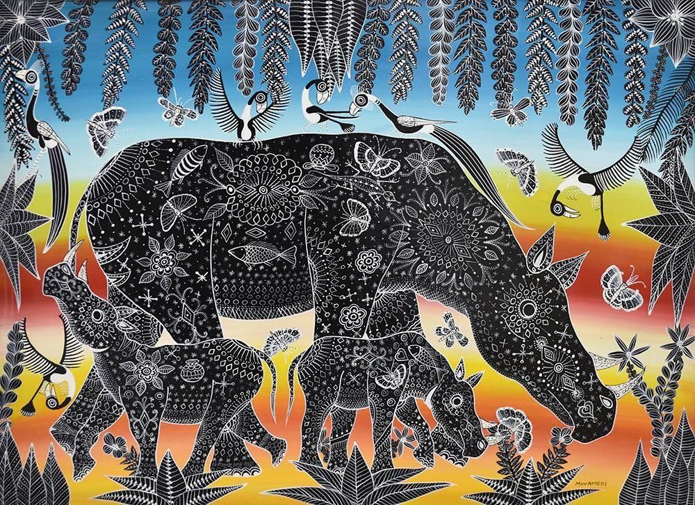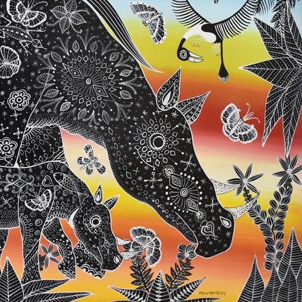 ☆モノトーンで表現された美しい模様のサイの親子が、熱帯の植物の下を仲良く歩みます。虹色の背景に繊細に描かれた、ムワメディの作品です。