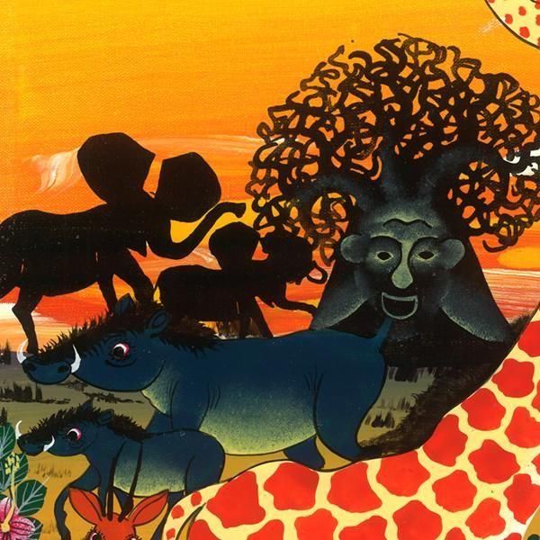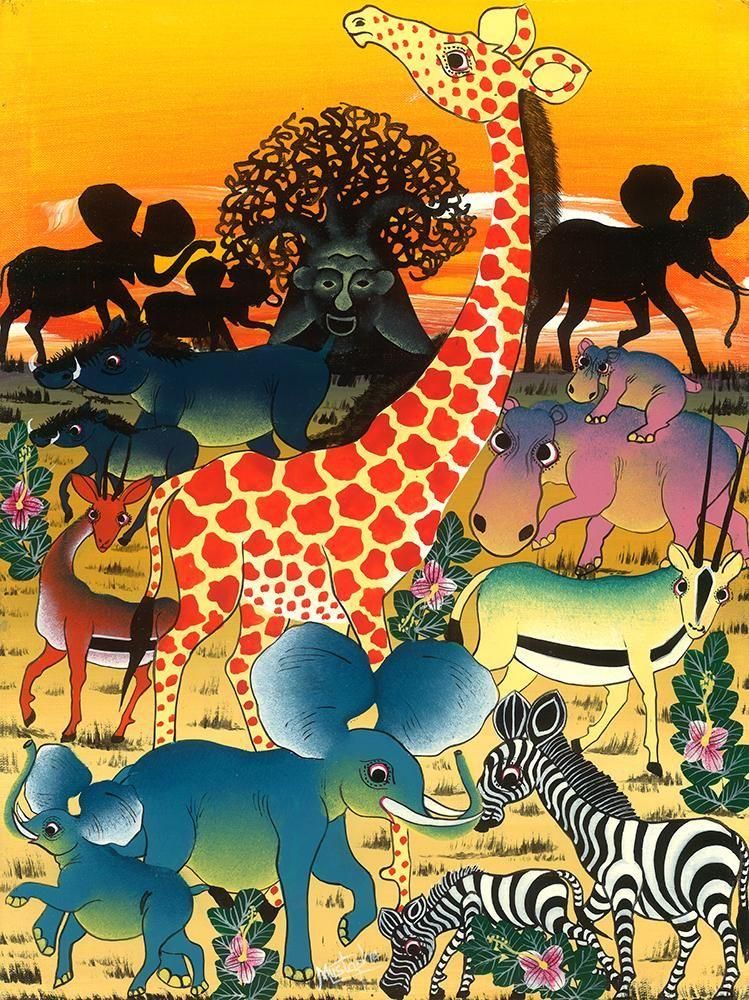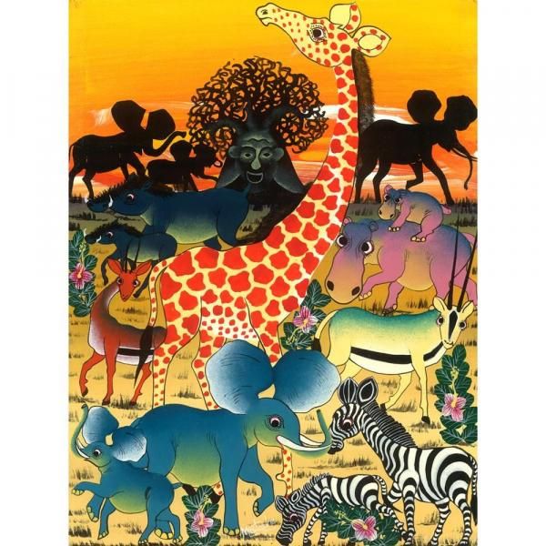 ☆バオバブの大樹に宿る精霊(シャターニ)が、朝日に染まるサバンナの大地に集うキリン、ゾウの親子、シマウマの親子、カバの親子、ガゼル、イノシシなど、動物たちをやさしく見守る、幻想的なムスターファの作品です。