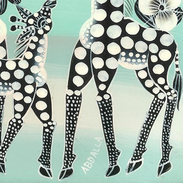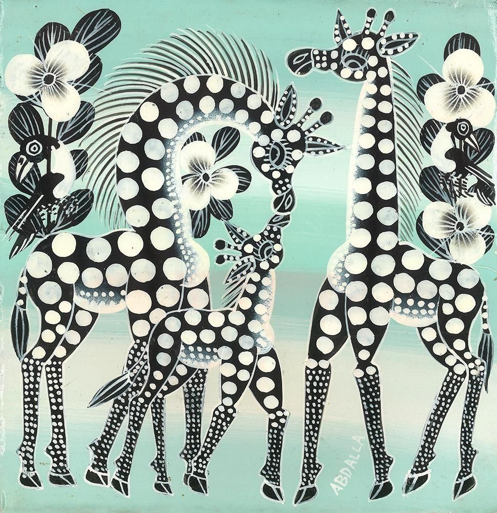 ☆仲良く語らうキリンの家族と鳥が、グリーングラデーションを背景にモノクロで美しく描かれた、アブダラの作品です。