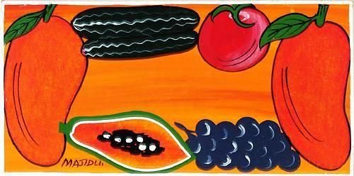 ▼オレンジバックに、マンゴー、ブドウ、さまざまなフルーツが、カラフルに描かれた作品です。