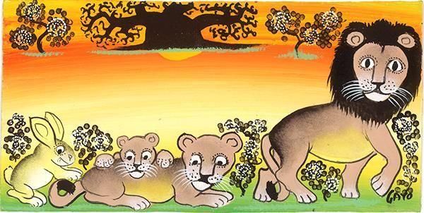 ▼バオバブの木がそびえるサバンナの大地に憩う、ライオンの家族が描かれた、人気アーティストガヨの作品です。