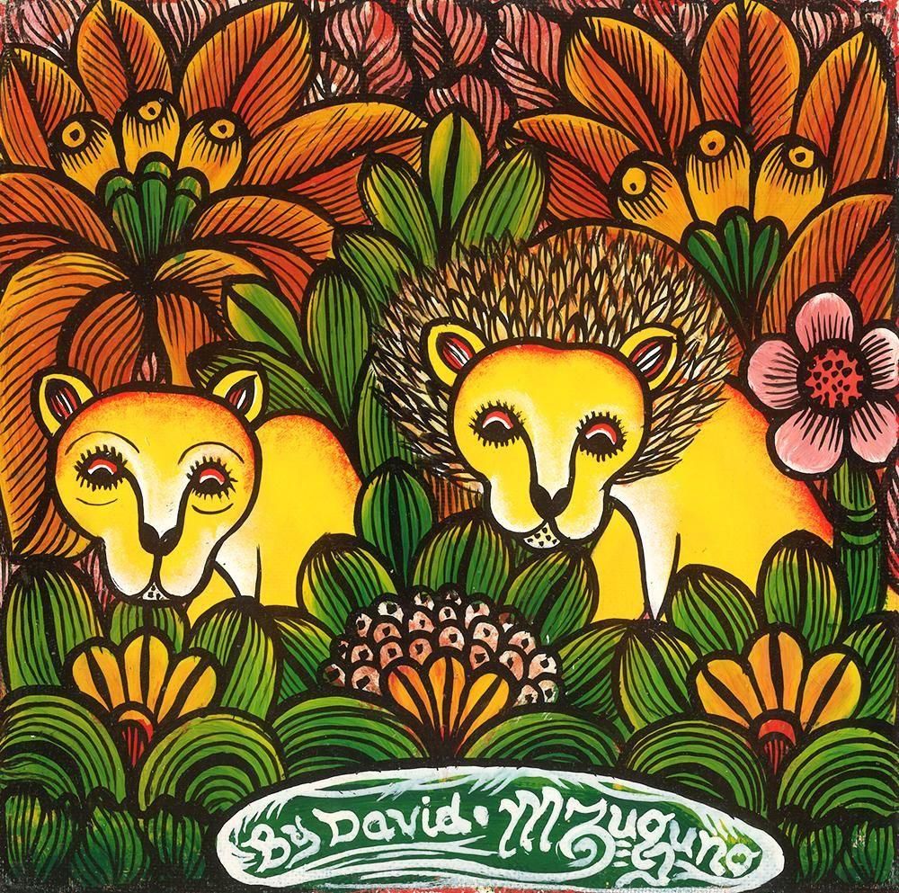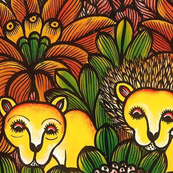 ☆熱帯の花木が密生する虹色のジャングルに生きるライオンの夫婦。様々な植生をカラフルに生き生きと描く、デビッド・ムズグノの作品です。