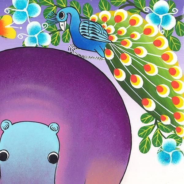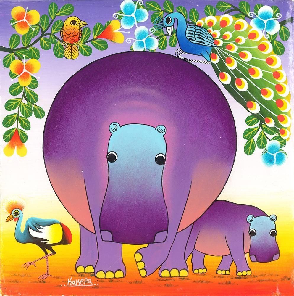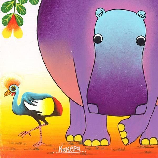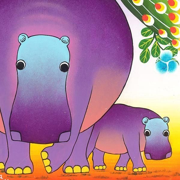 ☆レインボーグラデーション背景に、カバの親子が描かれています。背中に乗ったクジャクや、足元を歩くカンムリヅル、正面を向くユーモラスなカバの表情がやさしい、若手アーティスト カケパの作品です。