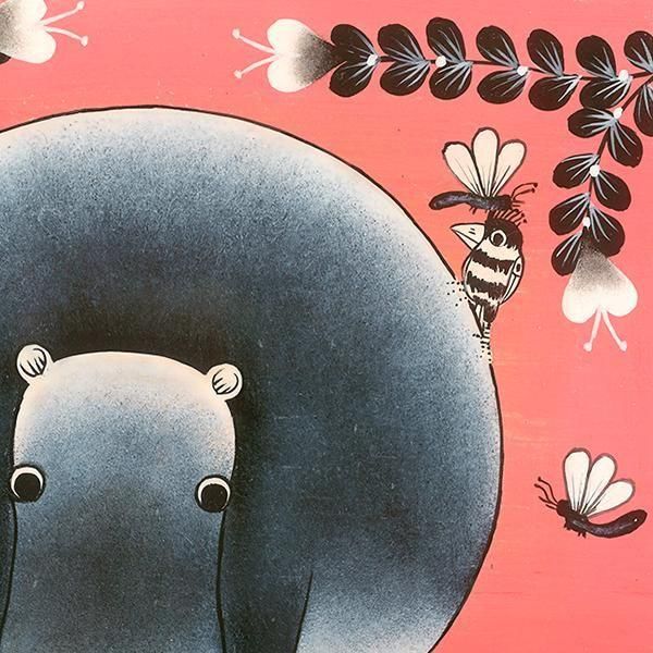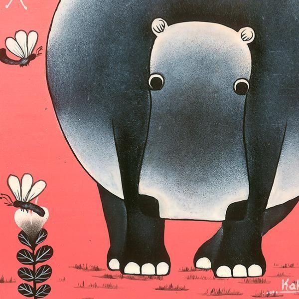 ☆ピンクの背景に、カバとヤマアラシが描かれています。小さな鳥を背中に乗せて、正面を向くユーモラスなカバの表情がやさしい、若手アーティスト カケパの作品です。