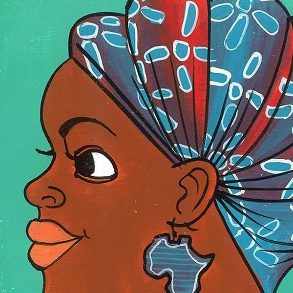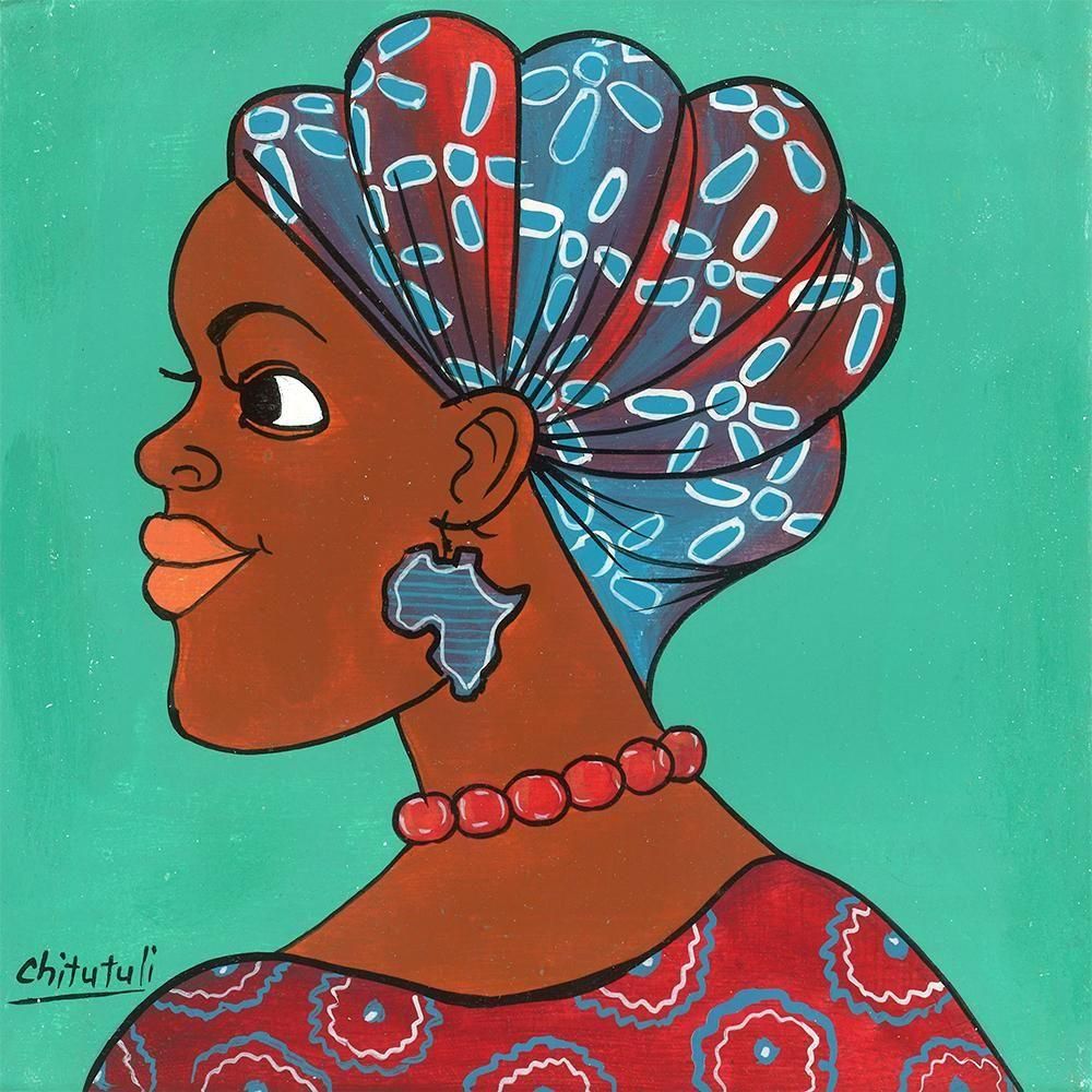 ☆ターバンを巻いた女性の横顔。ピアスはアフリカ大陸モチーフ。普遍的構図のアフリカンウーマンを、ティンガティンガらしくダイナミックに表現した、チトゥトゥリの作品です。