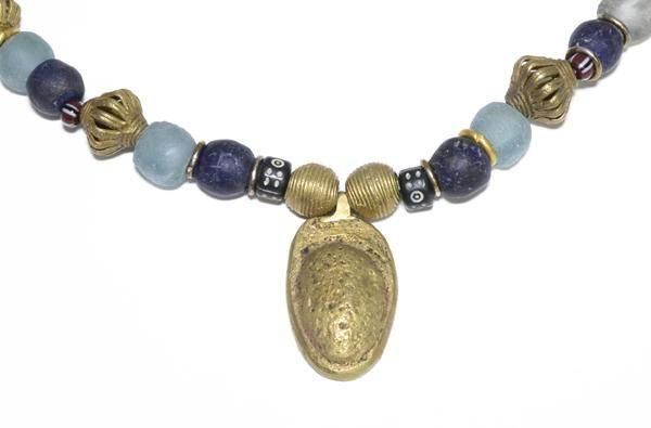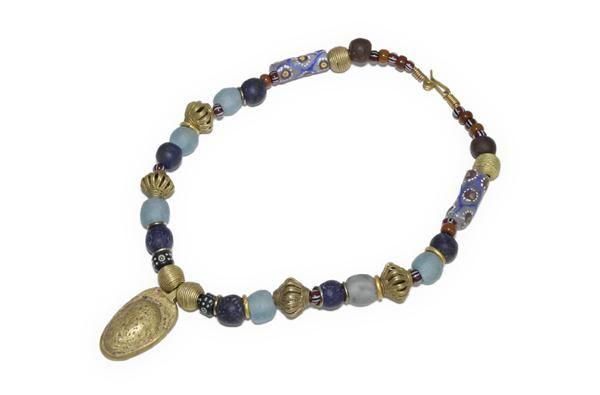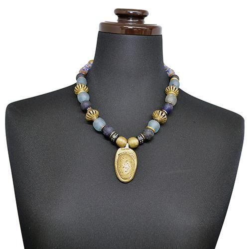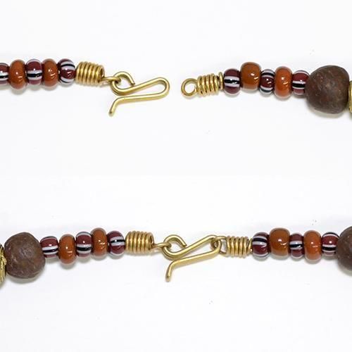 ☆文様が美しい再生ガラスビーズ、細い縞模様トンボ玉のエジャビーズ、透かし彫りの真鍮パーツや、デーツ(なつめやし)型の真鍮ペンダントヘッド。存在感のあるパーツが組み合わされた、重厚なデザイン。