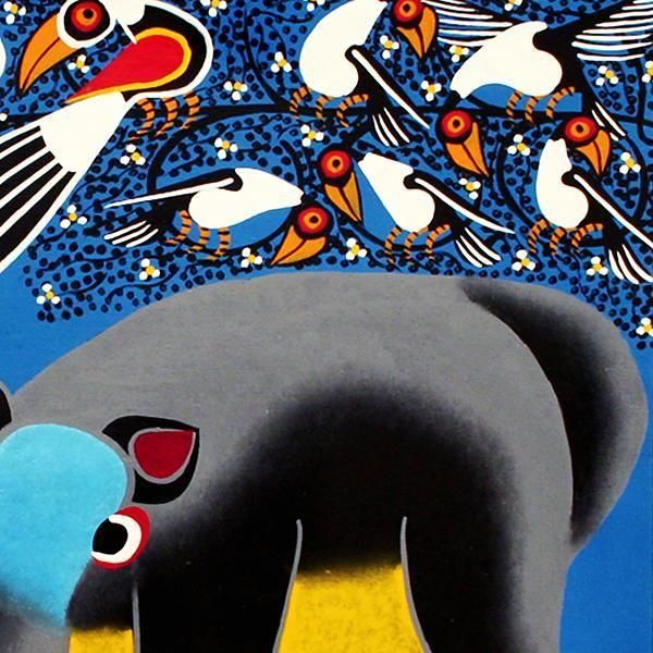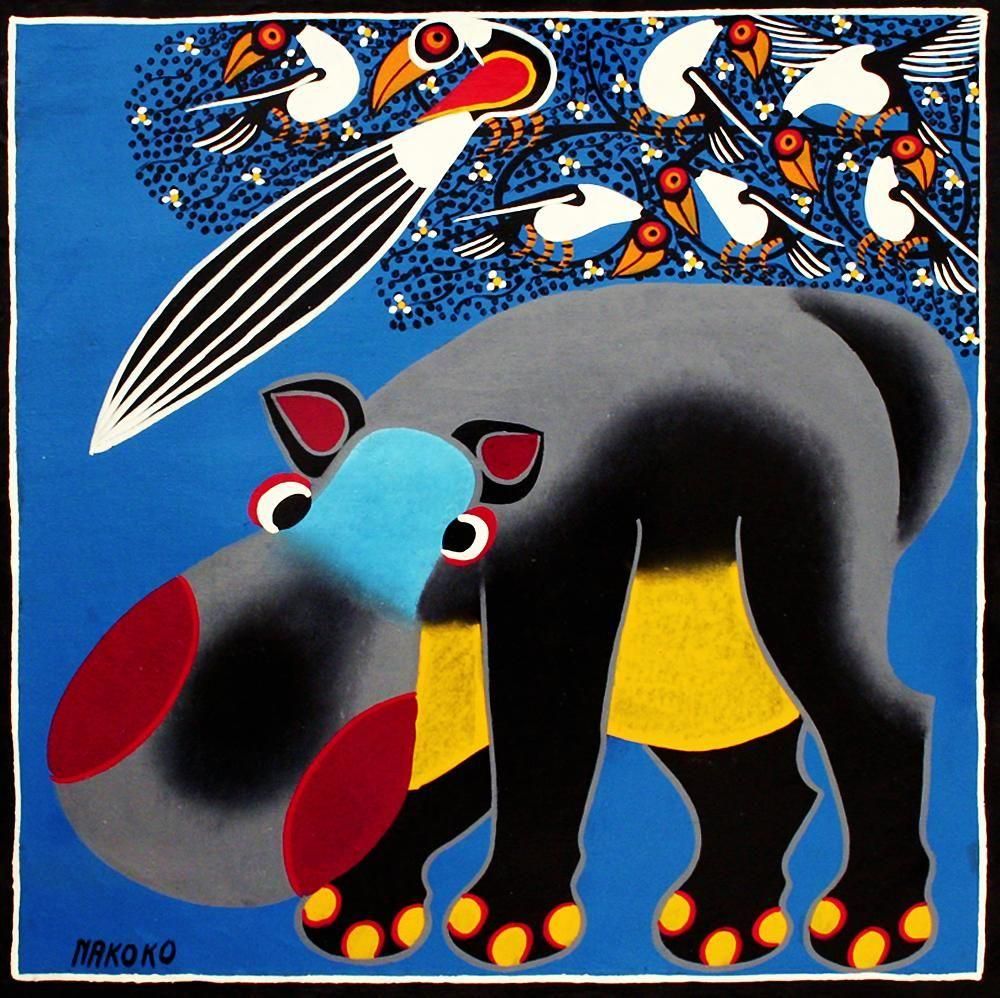 ☆真っ赤なほっぺをした、愛くるしいカバ。花の樹にはオナガドリとムナジロガラスが集います。アモンデの弟ナココのクラシックスタイルの作品です。
